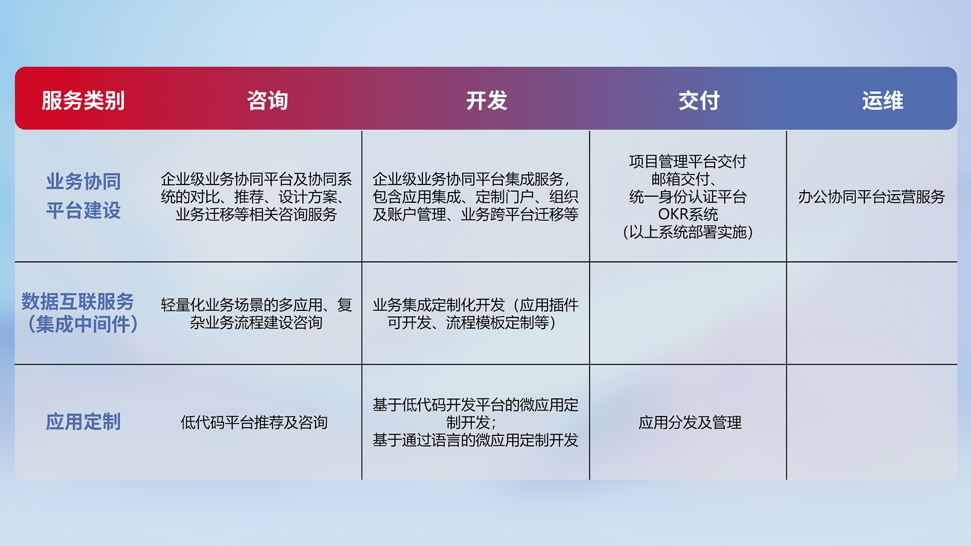 针对钉钉、、、、企微、、、IDaas等平台级产品提供产品的规划、、、方案、、、、交付、、、定制化开发等服务,,实现如统一协同办公、、智能客户服务、、、、混合会议管理、、智能数据查询、、等业务场景,,,,实现数字化转型。。。。