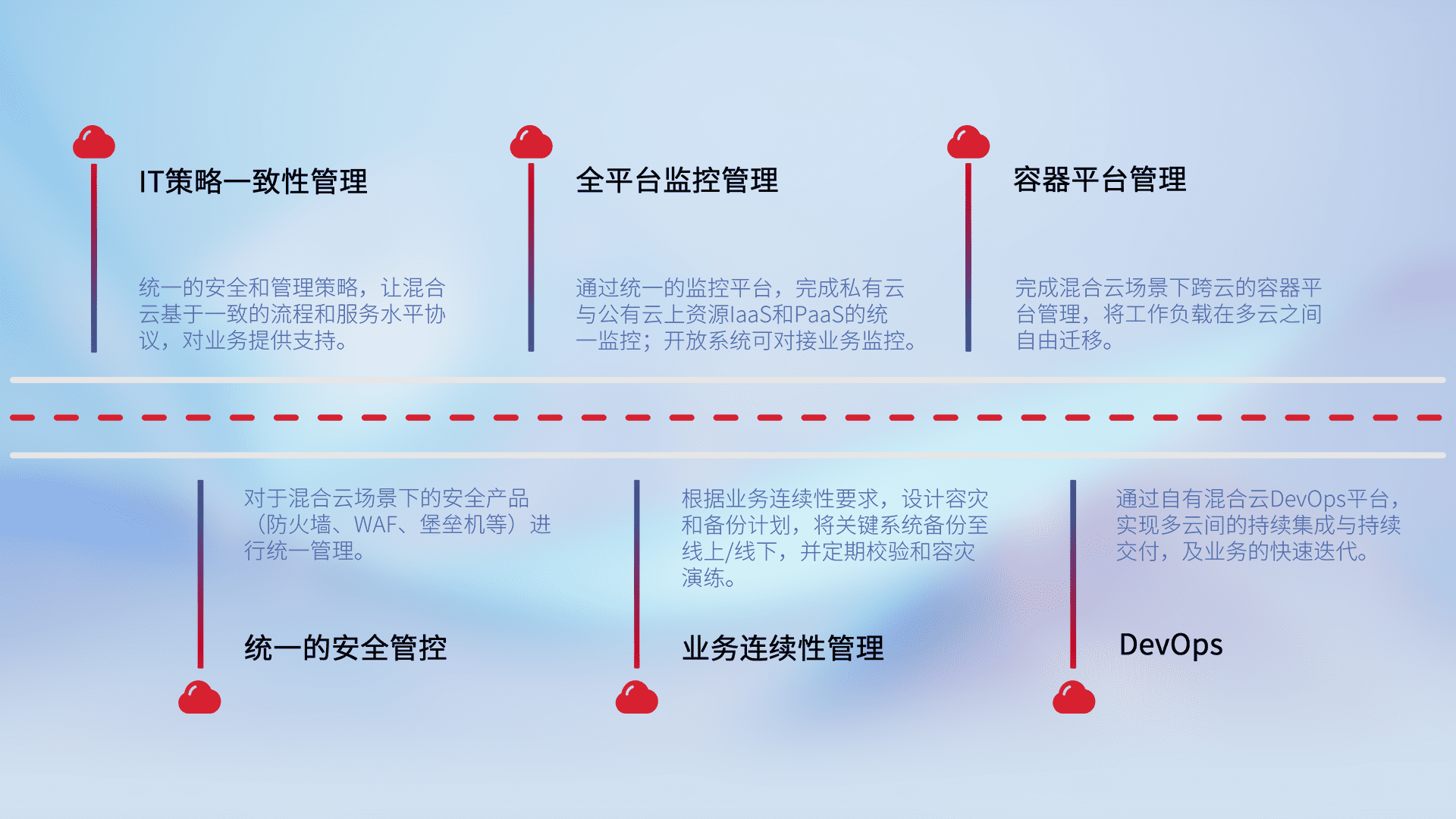 通过多云纳管,,,,以统一的资源数据模型把客户的云资源进行抽象和封装,,,进而实现对多云资源的统一操作,,,保障云资源管理的可靠性、、、、稳定性与可用性。。量身定制化运维内容,,配置、、开发运维、、、补丁管理、、、、备份、、监控、、、认证和访问管理、、、审计和日常巡检等,,,,保障在用云过程中的可靠度,,,,稳定度以及高可用率。。。